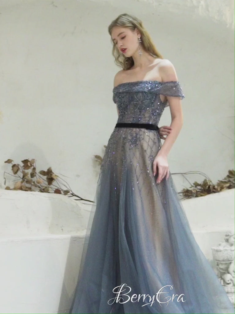 Off Shoulder A-line Navy Beaded Prom Dresses, Princess Core Dresses, Newest Prom Dresses, 2023 Prom Dresses